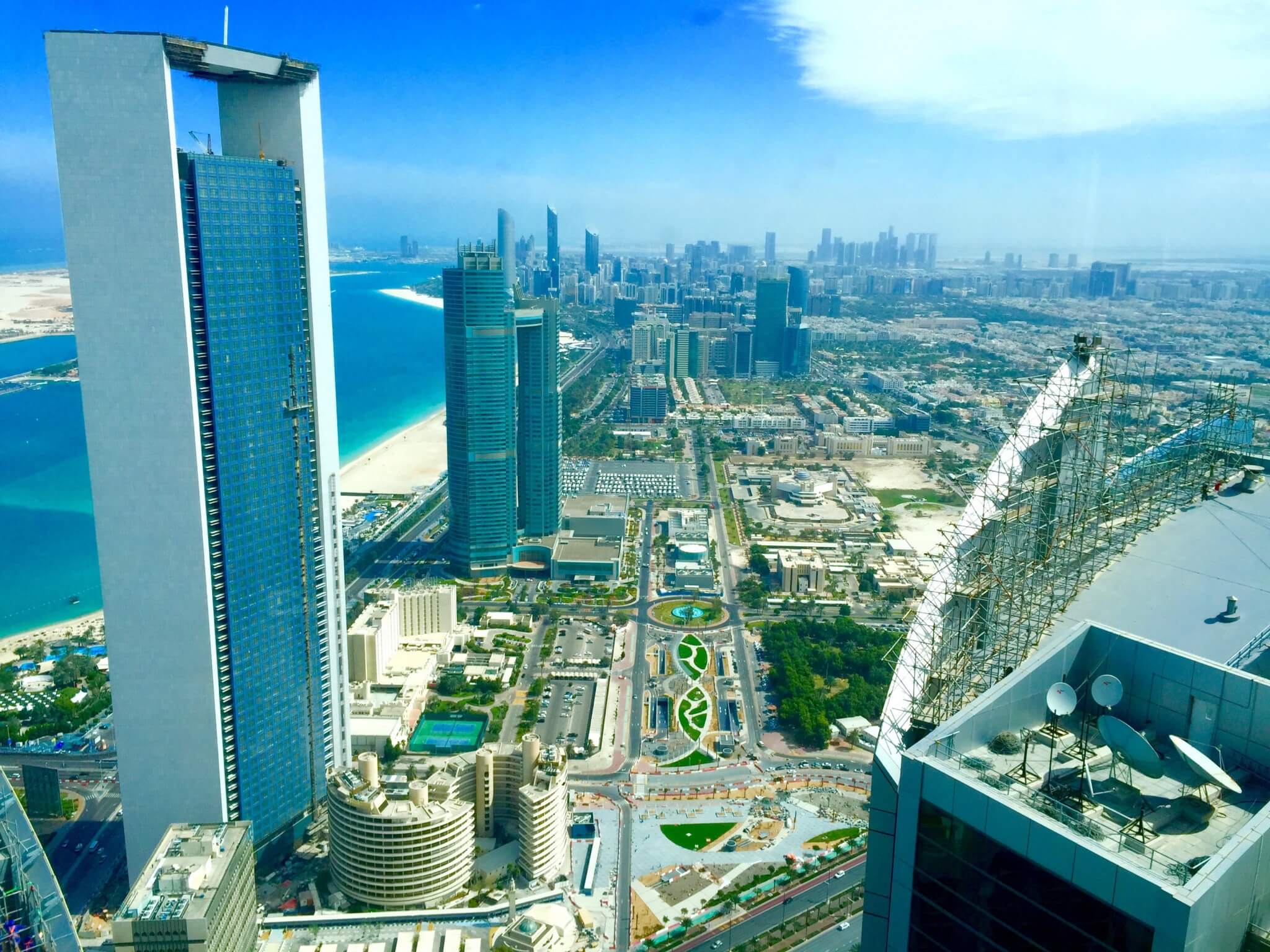 Wir sind die komplette Strecke abgefahren und an einigen Punkten ausgestiegen. Unser erster Stop sind die Ethiad Tower gewesen. Dort gibt es im 74. Stock eine Aussichtsplattform, die wir uns angucken wollten. Leider ist die nicht wirklich einfach zu finden gewesen. Im Tower2 direkt beim Hotel rechte Seite gehts aufs Observation Deck. Wenn man ein Ticket von BigBus hat, zahlt man nur die Hälfte.