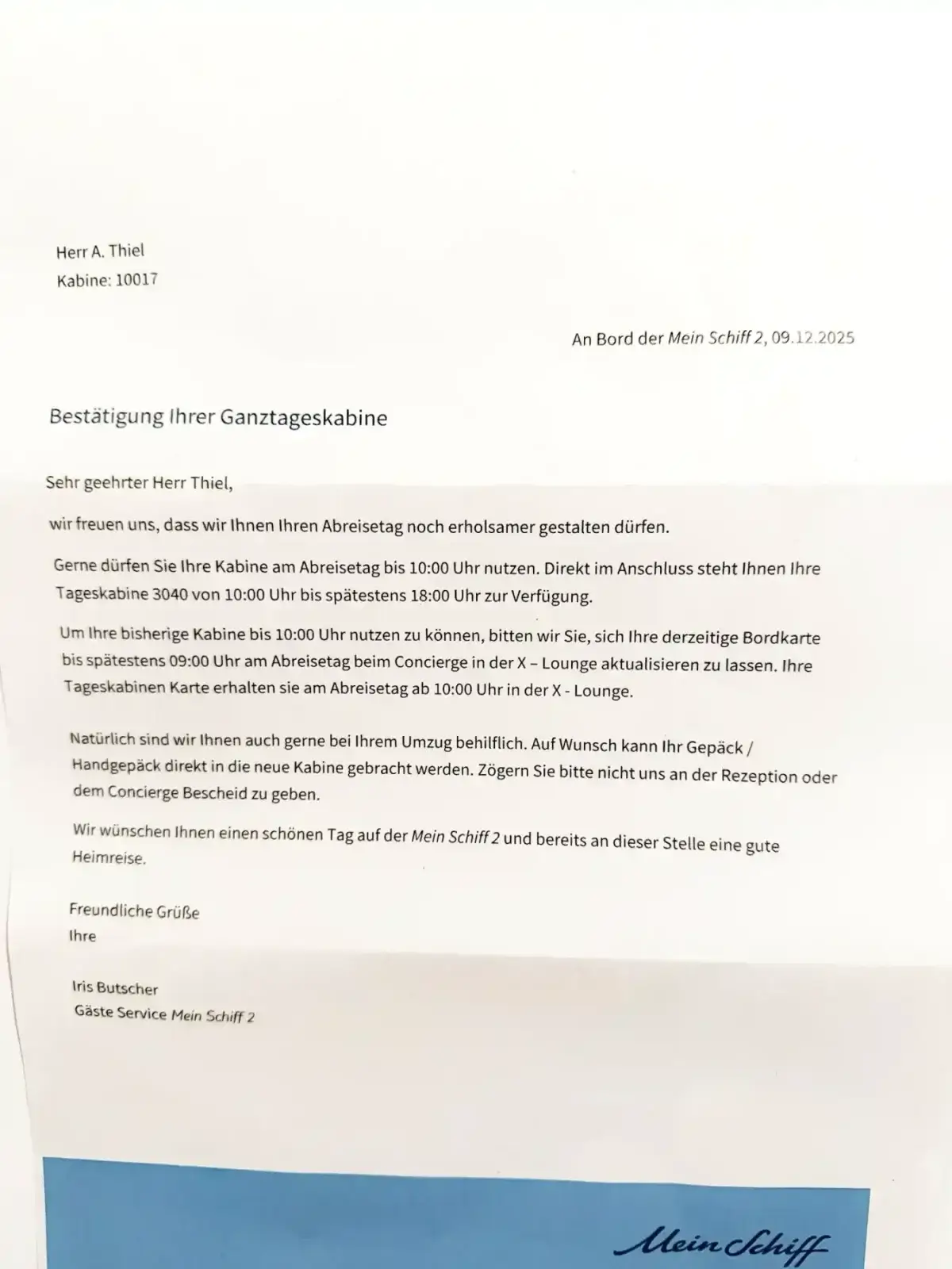 Morgen müssen wir zwischen 08:30 Uhr und 09:30 Uhr für unseren Flug einchecken, da das ein Vollcharter ist können wir das direkt am Kreuzfahrtterminal machen. Danach verbringen wir noch ein bisschen Zeit auf dem Schiff. Zum Glück haben wir morgen wieder eine Tageskabine, da können wir uns vor dem Abflug noch mal anständig duschen und für den Flug umziehen.
